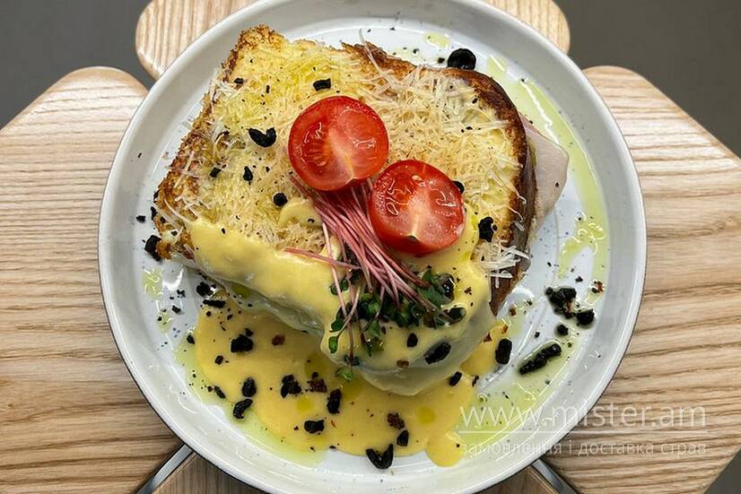 Сендвіч із булочок бріош з шинкою, моцарелою, маринованим огірком, пармезаном під соусом голандез.