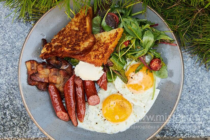 Два окатих яйця з мисливськими ковбасками, крем сиром, підсмаженим хлібчиком на маслі, беконом, міксом салату та томатами чері.