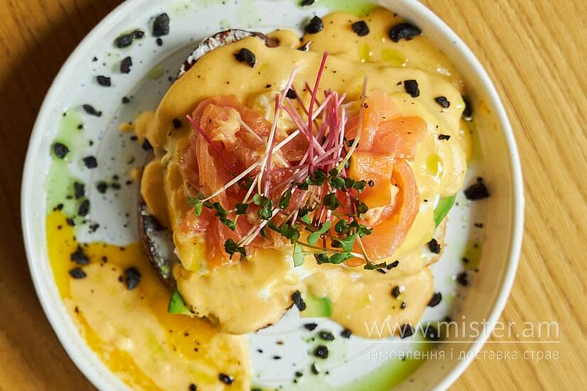 Два яйця бенедикт на бріоші з авокадо слайсами, крем сиром з фети, крашом з оливок, слабосоленим лососем та авторським соусом.
