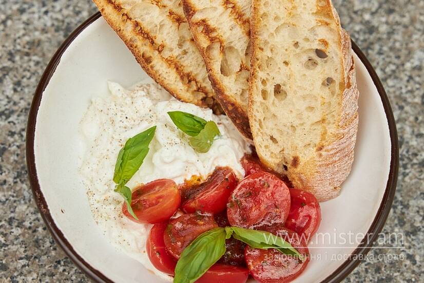 Сир страчателла з томатами чері, бальзамік, салатною заправкою та хрусткою чіабатою.
