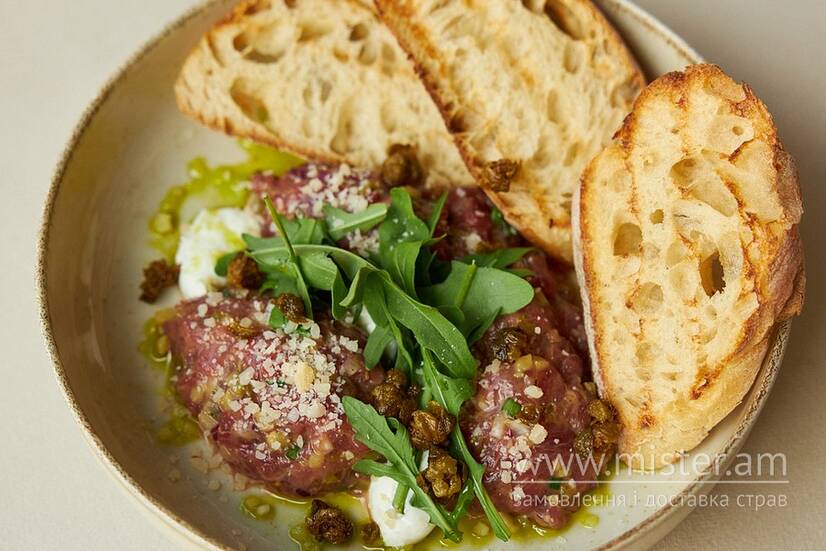 З відбірної вирізки з каперсами, синьою цибулею, анчоусами, маринованим огірком, перцем чилі, подаємо чіабатою.