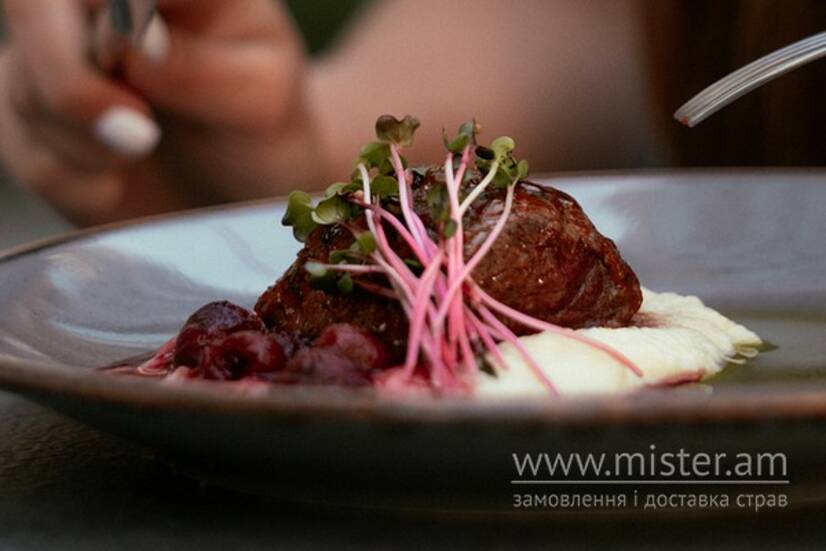 Яловича вирізка, пюре з селери, соус вишневий, часник.