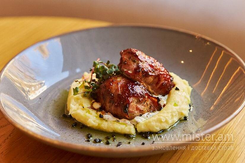 Вирізка свинна, бекон, часник, картопляне пюре, цибуля ріпчаста, соус грибний.