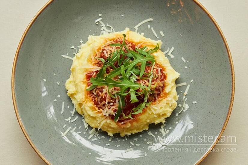 Соковиті мітболи з мішаного фаршу на подушці з ніжного картопляного пюре з додаванням томатного соусу, оливкової олії та пармезану.