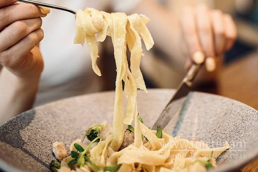 Паста, бекон, куряче філе, броколі, вершки, пармезан.