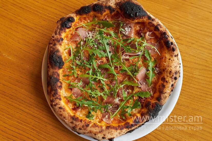 Тісто ферментоване,томатна основа, вершкова основа з маскарпоне, моцарела, томати в'ялені, прошуто, пармезан, рукола, часникова олія.