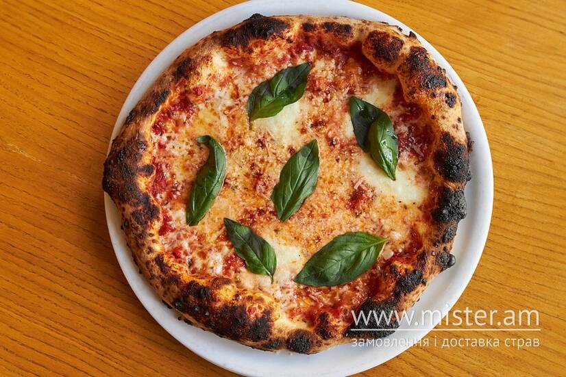 Тісто ферментоване, томатна основа, моцарела, моцарела в розсолі, олія оливкова, пармезан, базилік, часникова олія.