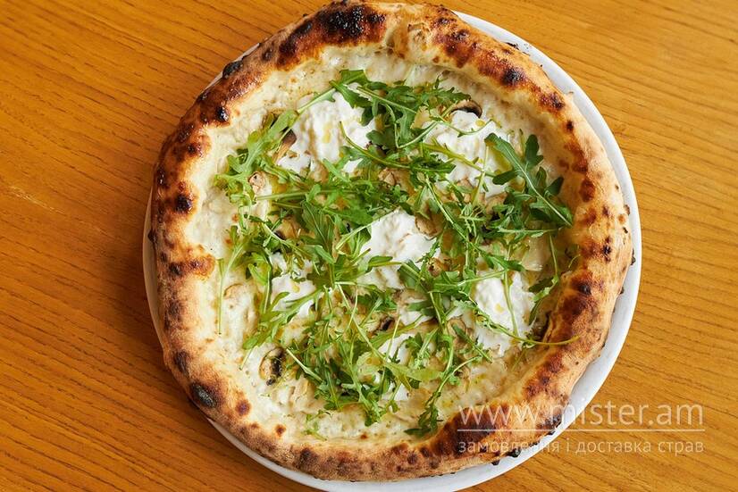 Тісто ферментоване, вершкова основа бешамель, моцарела, куряче філе, печериці, страчатела, олія трюфельна, рукола, часникова олія.