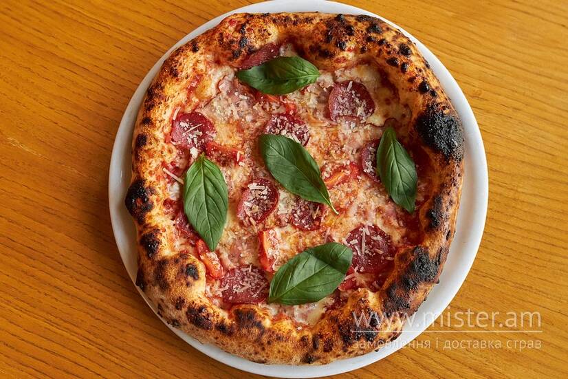 Тісто ферментоване, томатна основа, моцарела, салямі, бекон, помідори чері, пармезан, базилік, часникова олія.