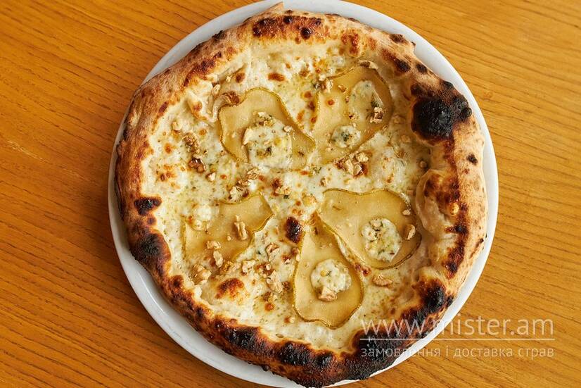 Тісто ферментоване, вершкова основа бешамель, моцарела, груша, дор блю, горіх грецький, мед, часникова олія.