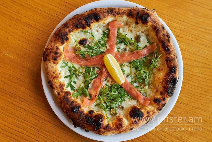 Тісто ферментоване, вершкова основа з маскарпоне, моцарела, лосось слабосолений, каперси, часникова олія, лимон.