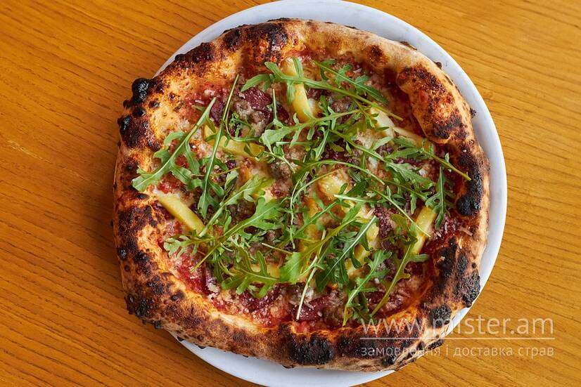 Тісто ферментоване, томатна основа, моцарела, ковбаски мисливські, мітболи, картопля фрі, пармезан, рукола, часникова олія.