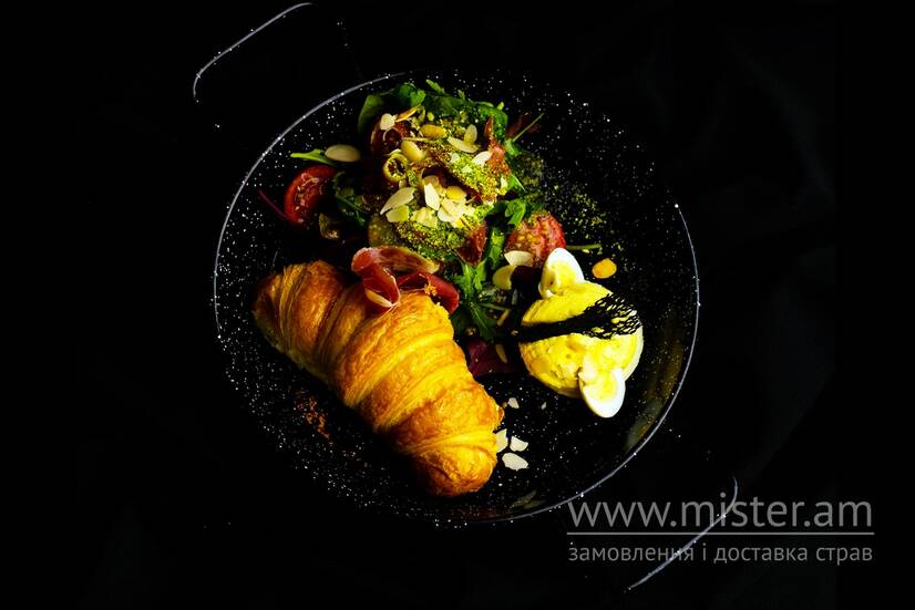 Салат-мікс, черрі, яйце куряче, яйця перепелині, соус, оливки, пармезан, мус яєчний, прошутто.