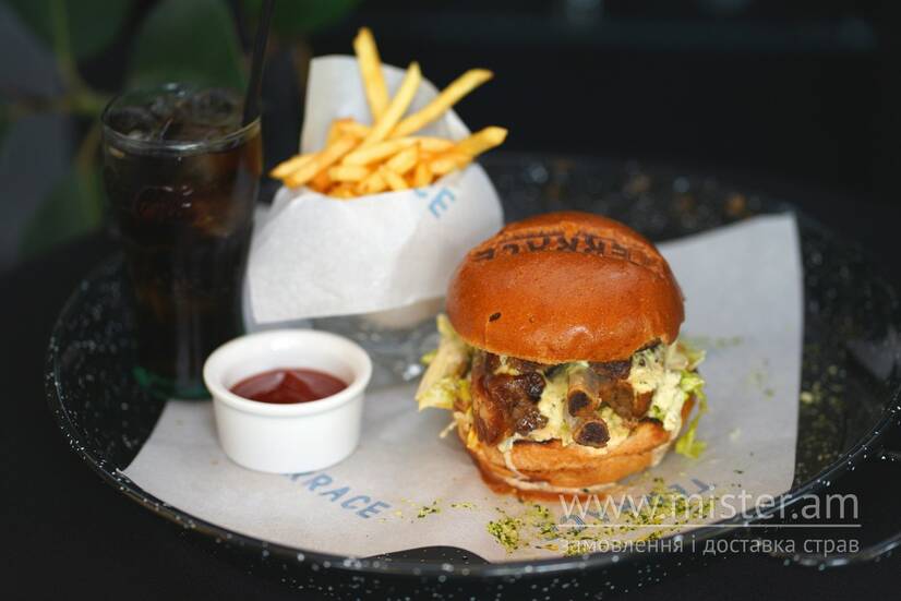 Про наш "Шеф-бургер" гудить все місто, про цей - будуть ходити легенди. Свіжа булочка бріош, томлені свинні ребра, мікс-салат, огірок маринований, соус цацикі та bbq, подається з картоплею фрі та колою.