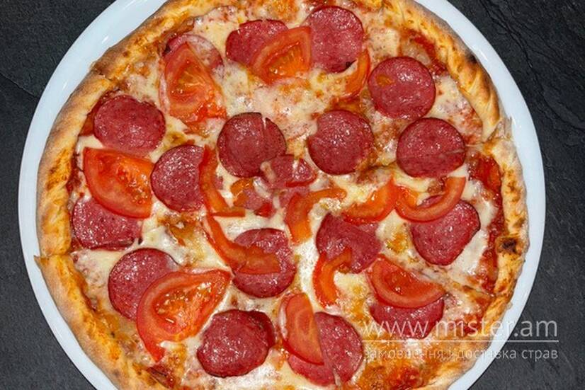Томатна основа, моцарела, салямі, помідори.