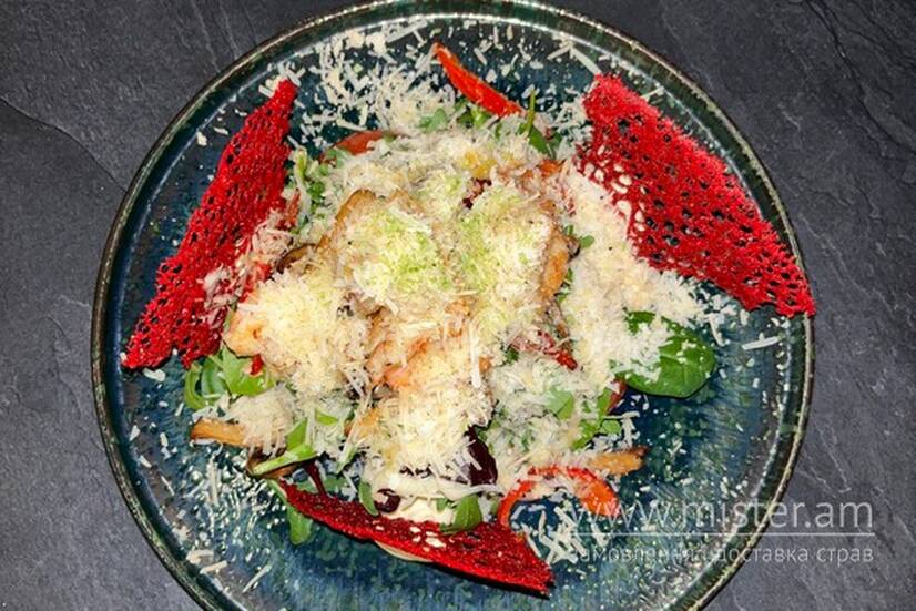 Соус "Цезар", мікс-салат, печериці та болгарський перець, креветки, томати, крутони, крем-мус, пармезан.