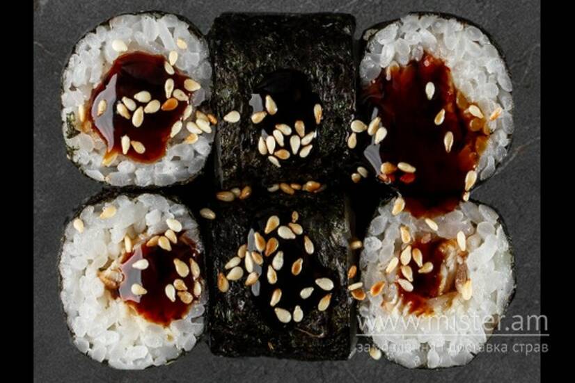 Суші: Макі огірок, Макі авокадо, Макі лосось, Рол "Філадельфія Томаго", Рол "Філадельфія класична", Рол "Філадельфія Каппа", Рол "Хот Сякі", Рол "Каліфорнія класична", Рол "Каліфорнія лайт", Рол "Каліфорнія Тобіко Сякі", Рол "Дракон Фуку Ріо", Рол "Дракон Кінруо", Рол "Блек хебі", Рол "Якедо Салмон", Рол "Кіцуне", Рол "4 сири", Суші-сет "Лайт", Суші-сет "Сан сет", Суші-сет "Філадельфія", Рол "Темпура Сякі", Рол "Філадельфія Ебі", Рол "Темпура Унагі"