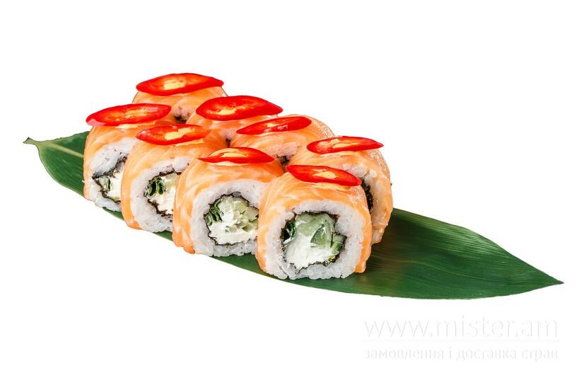 Лосось, огірок, зелена цибуля, сир Філадельфія, соус спайсі, чилі.