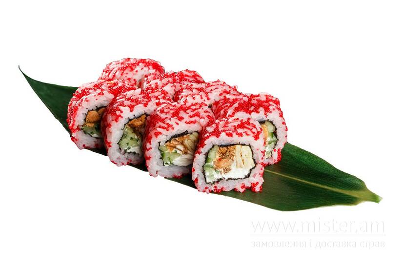 Смажений лосось, омлет тамаго, ікра тобіко, огірок, сир Філадельфія.