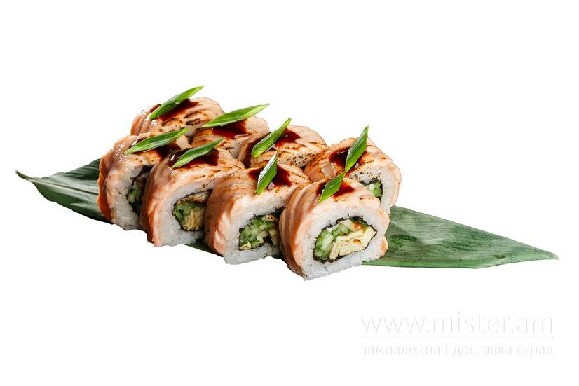 Обпалений лосось, вугор, огірок, омлет томаго, масаго, соус унагі, зелена цибуля.