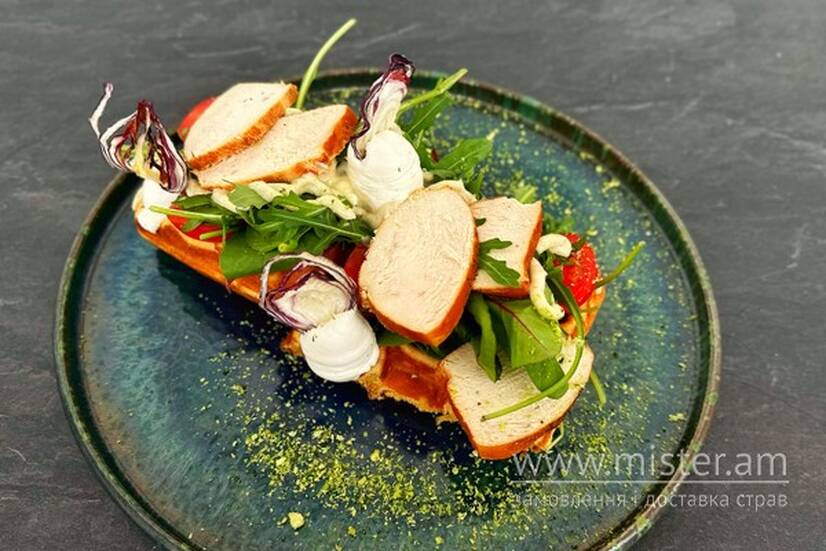Солодкава гофра, з міксом салату, помідорами чері, крем-сиром та копченою курочкою, заправлена соусом цезар.