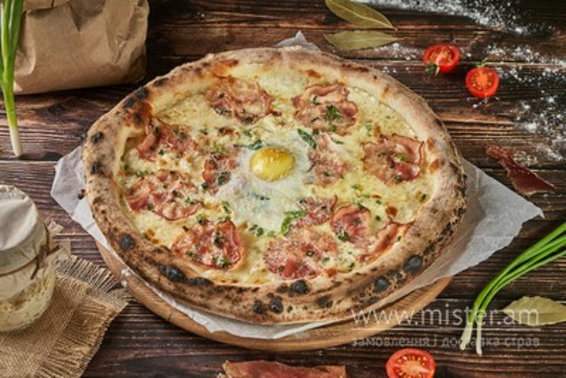 Вершковий соус, сир моцарела, бекон, жовток курячого яйця, зелена цибуля, сир пармезан.