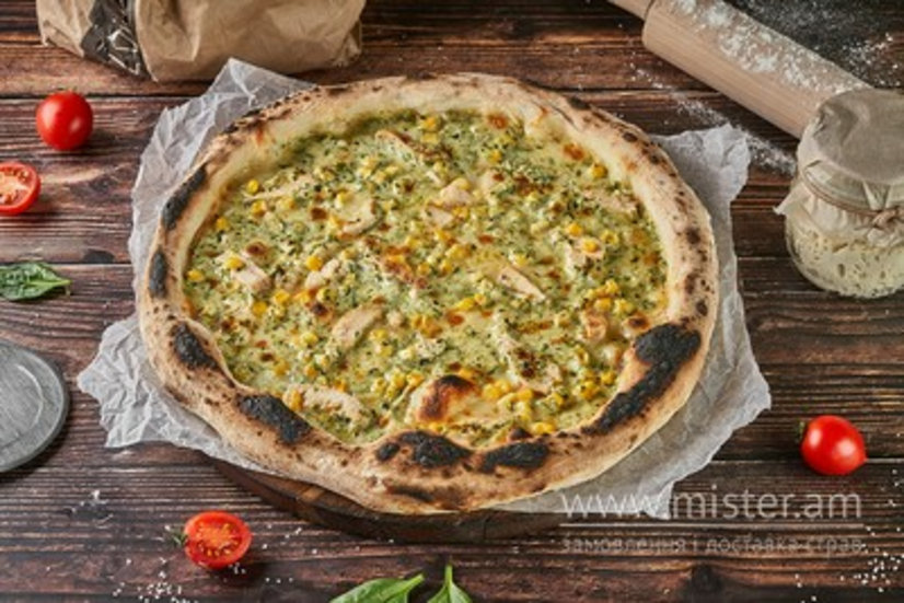 Вершковий соус, сир моцарела, куряче філе, шпинат, кукурудза.