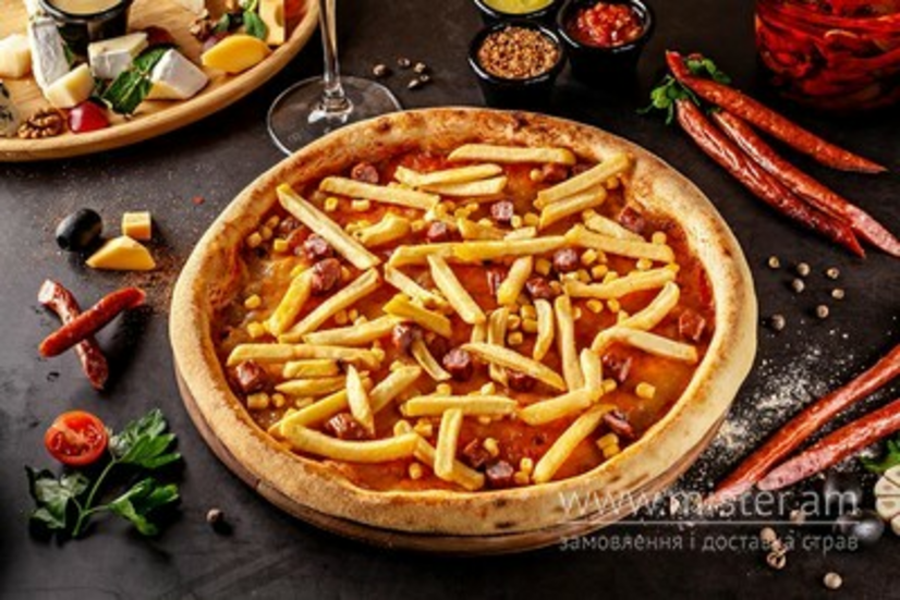 Томатний соус Пілаті, сир Моцарела, мисливські ковбаски, кукурудза, картопля фрі.