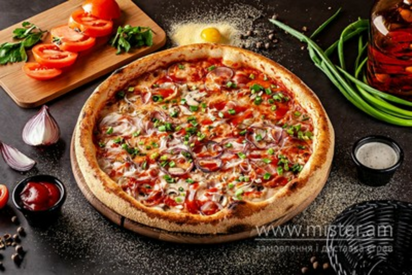 Барбекю соус, сир моцарела, бекон, куряче філе, гриби печериці, синя і зелена цибуля.
