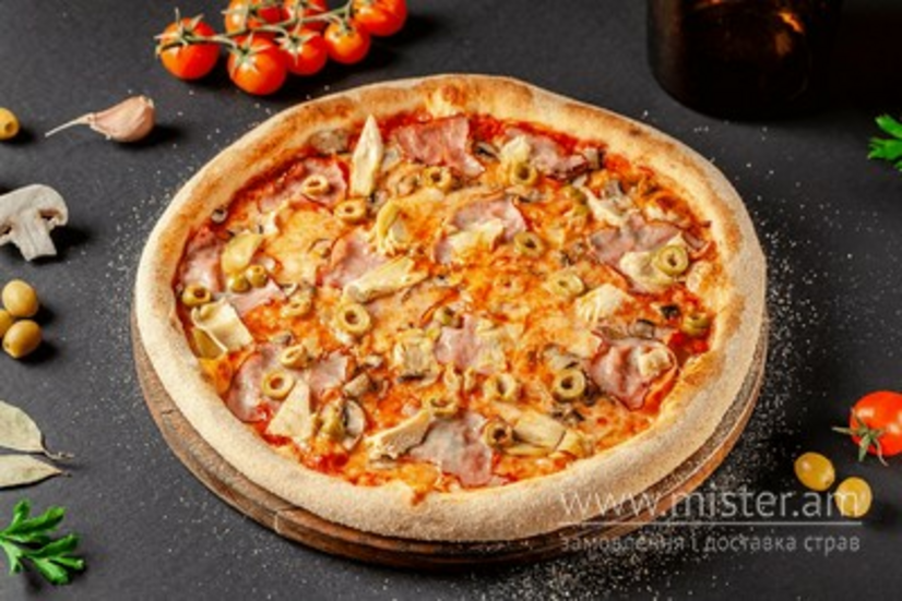 Томатний соус пілаті, сир моцарела, артишоки, гриби печериці, шинка, оливки, орегано.