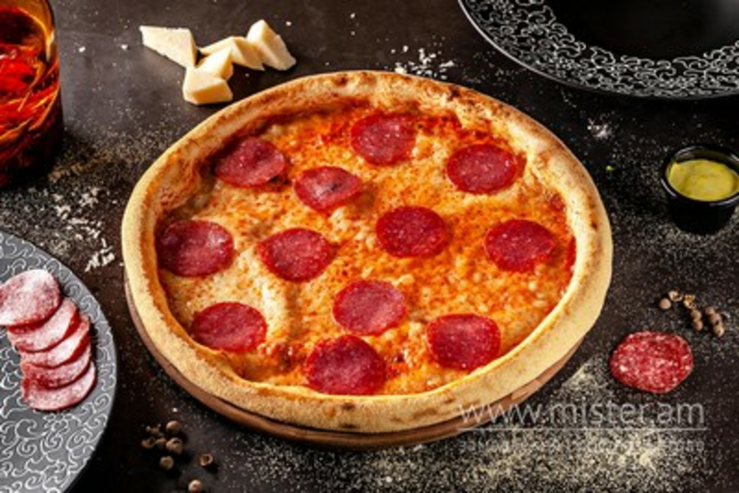 Томатний соус пілаті, сир моцарела, італійська ковбаса салямі.