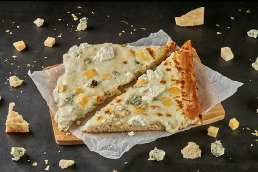 Пишне тісто, потрійний сир моцарела, соус вершковий, сир рікота, сир гауда, сир горгонзола.