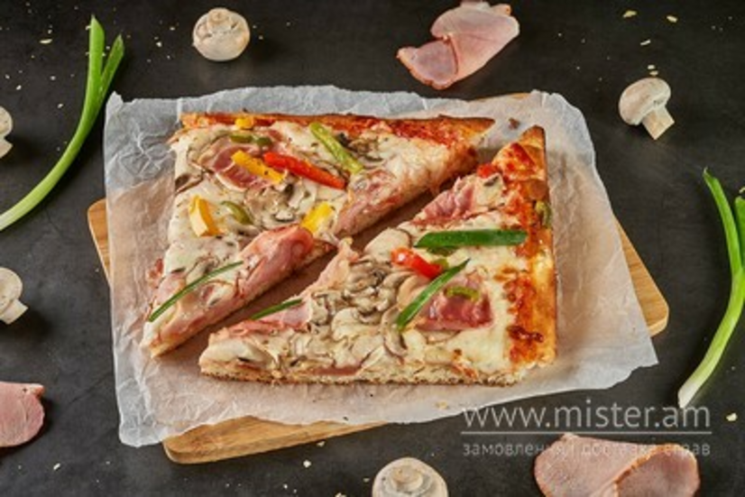 Пишне тісто, потрійний сир моцарела, томатний соус пелаті, бекон, печериці, болгарський перець, зелена цибуля.