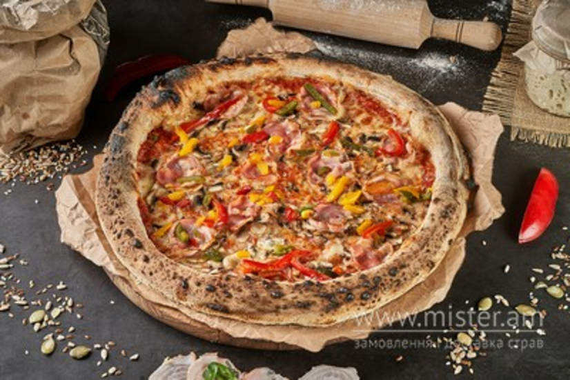 Томатний соус пілаті, сир моцарела, бекон, гриби печериці, перець болгарський, зелена цибуля.