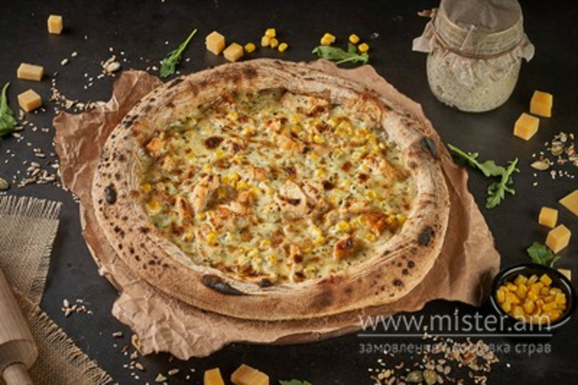Вершковий соус, сир моцарела, куряче філе, шпинат, кукурудза.