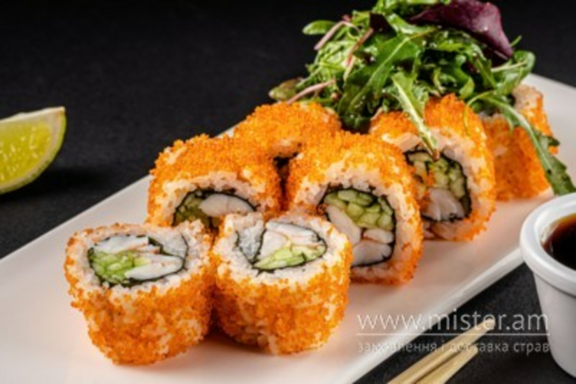 Норі, рис, тигрова креветка, огірок, ікра летючої риби.