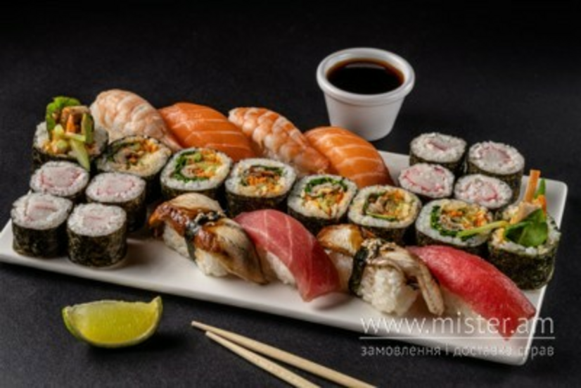 Тайський рол з вугрем, Нігірі з креветкою, Нігірі з тунцем, Хосомакі зі сніжним крабом, Нігірі з вугрем, нігірі з лососем.
