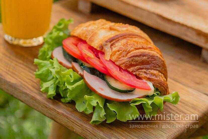 Натуральний круасан, наповнений соковитою шинкою, ніжним крем-сиром, з огірком та стиглим помідором, а також листям салату. Соус із домашнього майонезу та соєвого соусу.