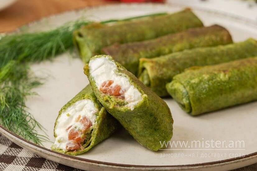 Млинці шпинатні з начинкою з ніжного вершкового крем-сиру і зі шматочками слабосоленої форелі.