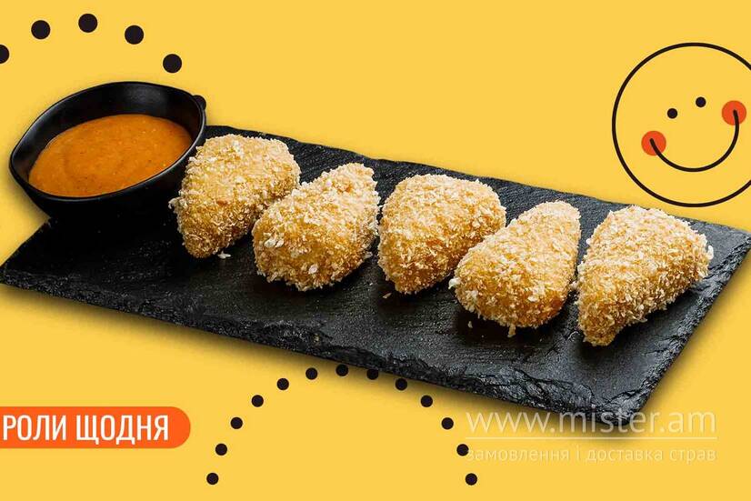 Моцарела, яйце, панірувальні сухарі, борошно темпура, соус горіховий (гострий).