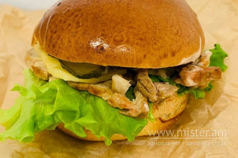 Листя салату, курка, огірок маринований, сир, кетчуп, майонез.
