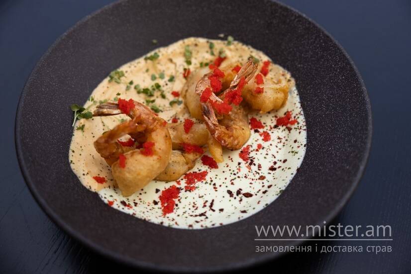 Хвости тигрових креветок обсмажені в клярі. Подаються з фірмовими соусами.
