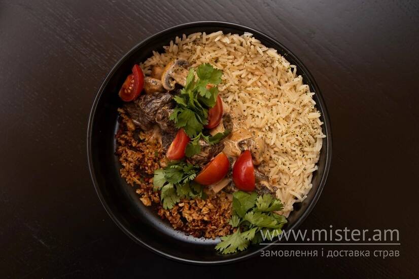 Боул зі смаженою телячою вирізкою, печерицями, цибулею порей, рисом заправленим бульйоном з телятини, міксом салату, кінзою та томатами чері.