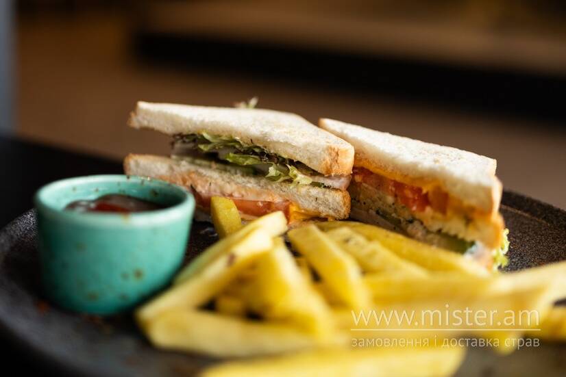 Тостовий хліб змащений фірмовим соусом з копченою курячою грудинкою, листям салату, огірком, томатами та сиром Чедер. Подається з картоплею фрі.