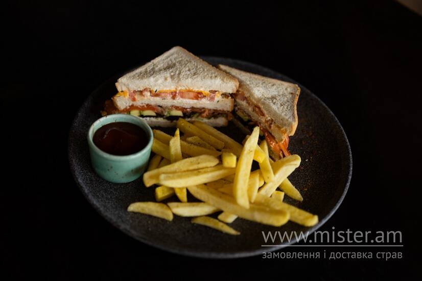 Тостовий хліб змащений крем-сиром зі слабосоленим лососем, авокадо, листям салату, томатами та сиром Чедер. Подається з картоплею фрі.