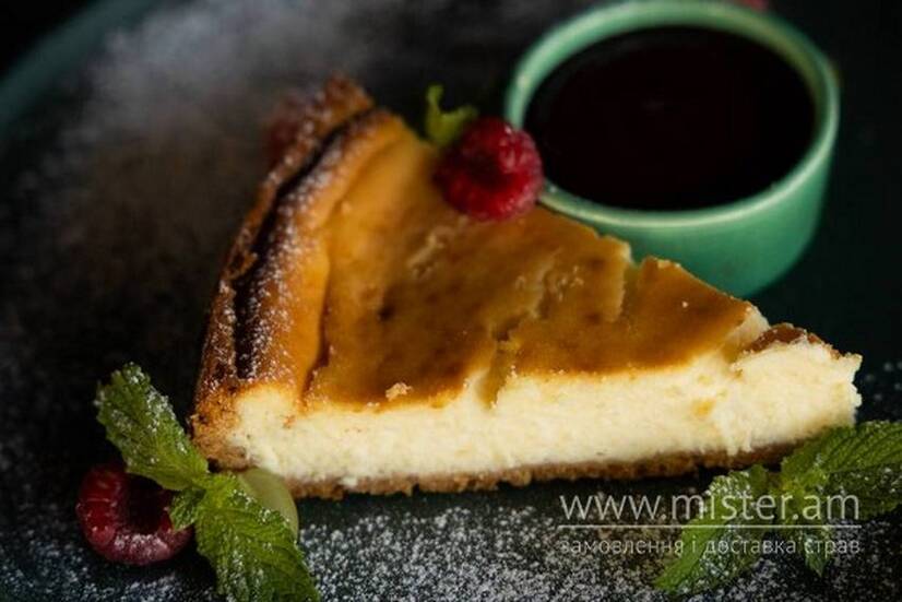 Класичний чізкейк з крем-сиру та вершків. Подається з соусом з журавлини та сезонними фруктами.