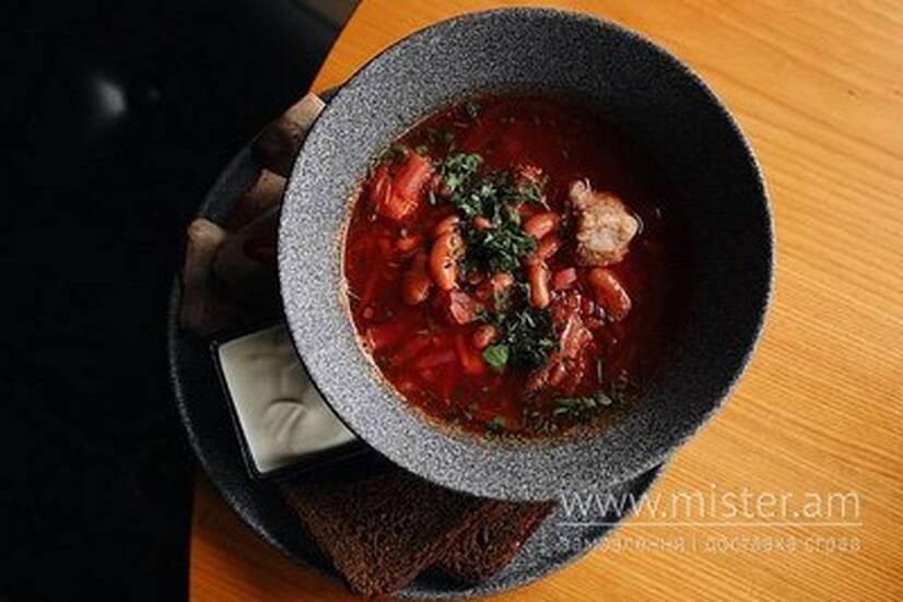 Борщ червоний зі свининою з підкопченим салом та сметаною