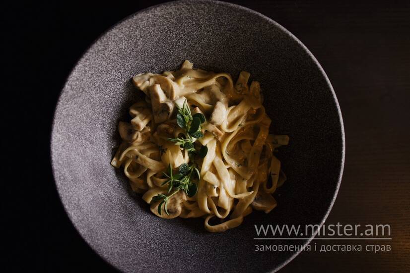 Паста "Тальятеле", печериці, білі гриби, вершки, вино, та спеції. Посипається пармезаном.