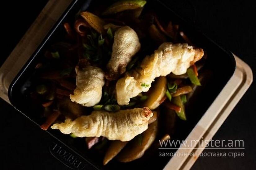 Соковите філе індички в хрусткій темпурі з обсмаженими овочами. Подається на гарячій пательні одразу з плити.