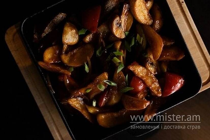 Філе яловичини, обсмажене з овочами до соковитої скоринки з часником, зеленою цибулею та розмарином. Подається одразу з плити на гарячій пательні.